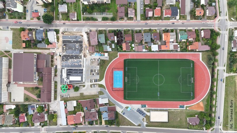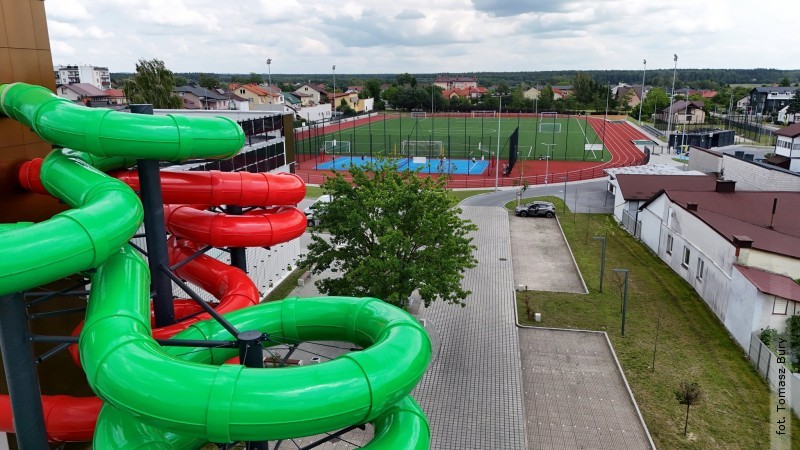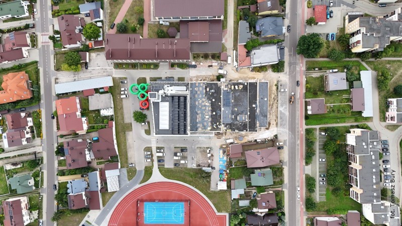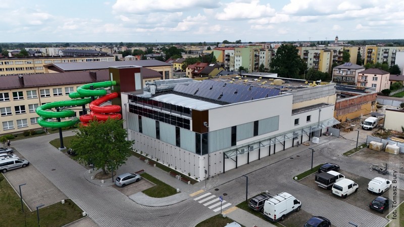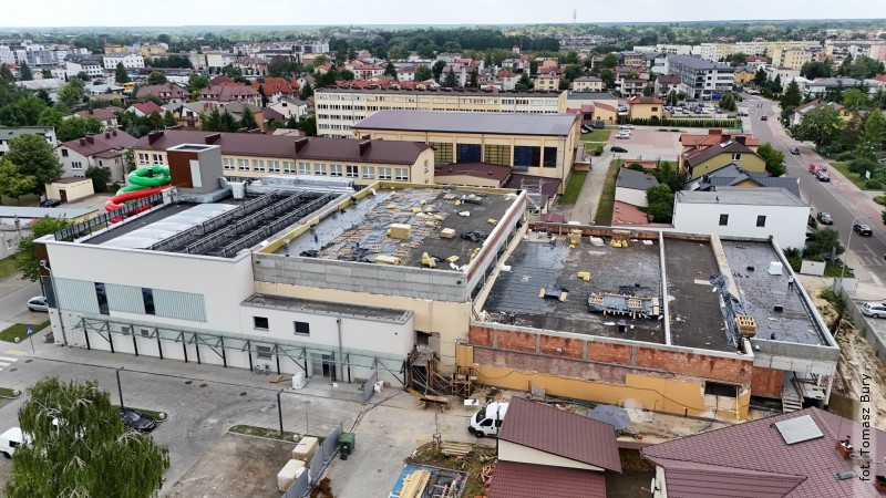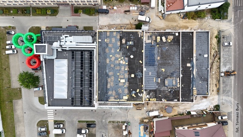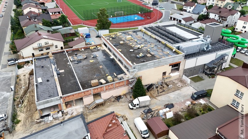 Zaawansowanie prac na podstawie zdjêæ z lotu ptaka pokazuje, jak dynamicznie przebiega realizacja inwestycji. Po ukoñczeniu obu etapów powstanie obiekt o ³±cznej powierzchni u¿ytkowej oko³o 3 760 m², z czego kluczow± czê¶ci± bêdzie basen o powierzchni lustra wody wynosz±cej oko³o 623 m², po³±czony z czê¶ci± rekreacyjn± zrealizowan± w ramach pierwszego etapu.