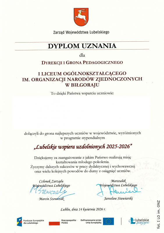 Ponad 40 uczniów I Liceum Ogólnokształcącego im. ONZ w Biłgoraju otrzymało stypendia w ramach programu "Lubelskie wspiera uzdolnionych". Uroczyste wręczenie wyróżnień odbyło się we wtorek 14 kwietnia w Lubelskim Centrum Spotkania Kultur.