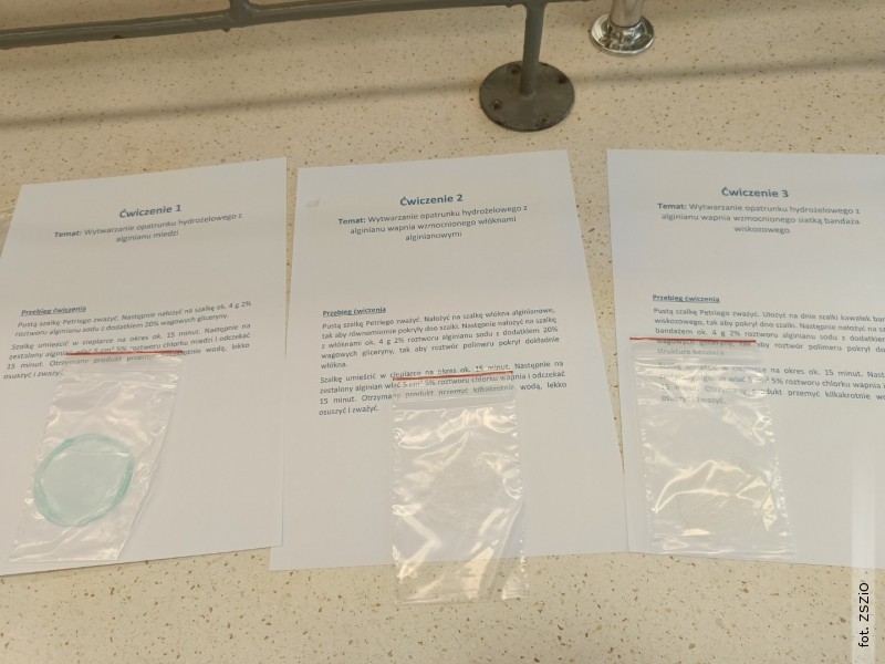 Na zajęciach "Tekstylne opatrunki hydrożelowe" zetknęli się z fascynującym światem chemii. Samodzielnie przygotowali trzy rodzaje opatrunków: z alginianu miedzi, z alginianu wapnia wzmocnionego włóknami alginianowymi oraz z alginianu wapnia wzmocnionego siatką bandaża wiskozowego.