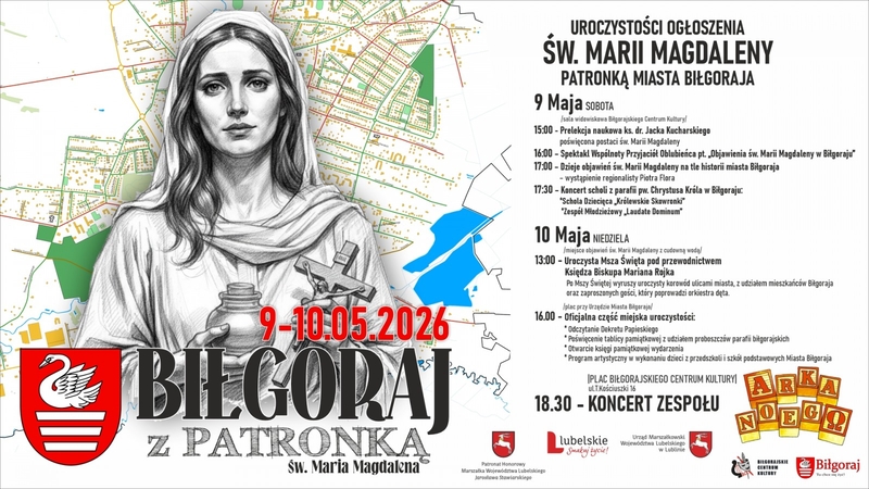 Biłgoraj z Patronką - św. Maria Magdalena![]() Gdzie: Biłgoraj, BCK Kiedy: 2026.05.09, godzina 15.00 2026.05.10, godzina 13.00 Opis: W drugi weekend maja mieszkańcy Biłgoraja i okolic będą mogli wspólnie przeżywać uroczystości poświęcone patronce miasta - św. Marii Magdalenie. W programie znalazły się inspirujące spotkania, poruszające widowisko, koncerty oraz uroczystości plenerowe. ![]() REKLAMA